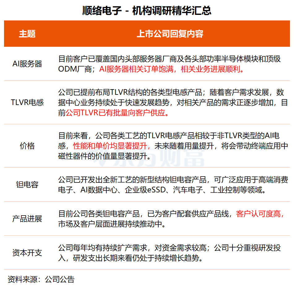 顺络电子近日接受中信证券、三井住友德思等11家机构调研。在调研中,顺络电子透露,公司AI服务器相关的订单饱满,相关业务进展顺利。