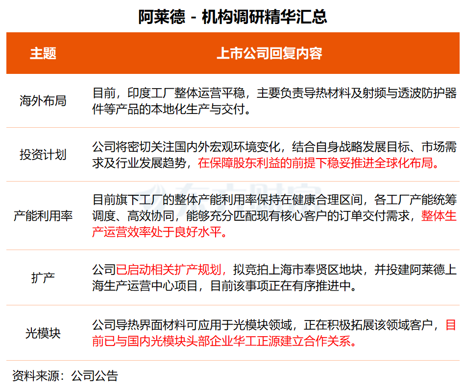 在调研中,阿莱德表示,公司导热界面材料可应用于光模块领域,公司正在积极拓展该领域客户,目前已与国内光模块头部企业华工正源建立了合作关系。