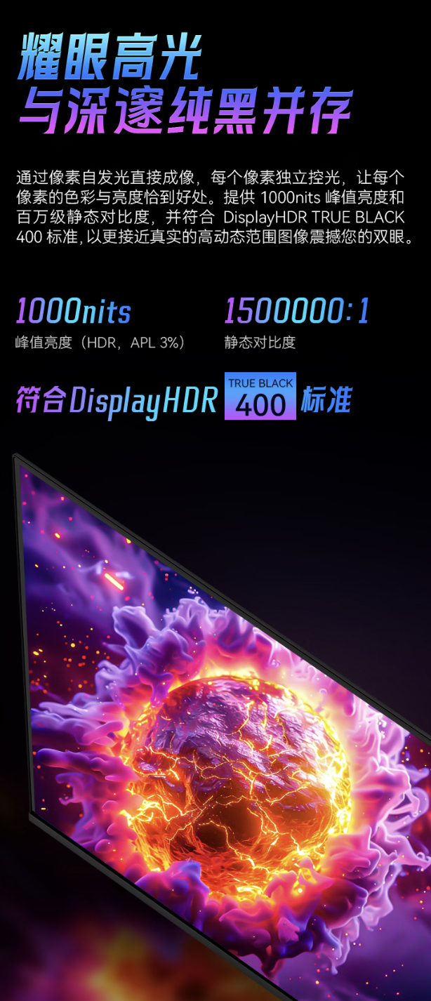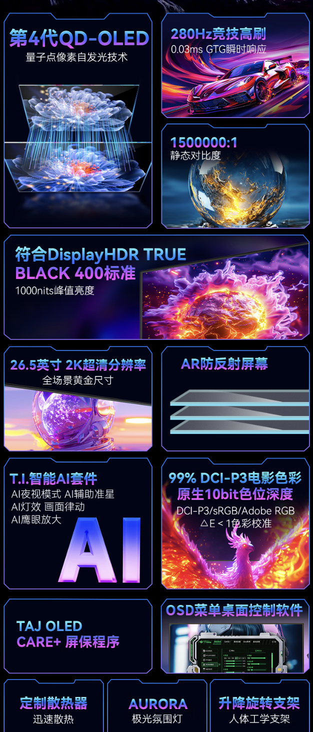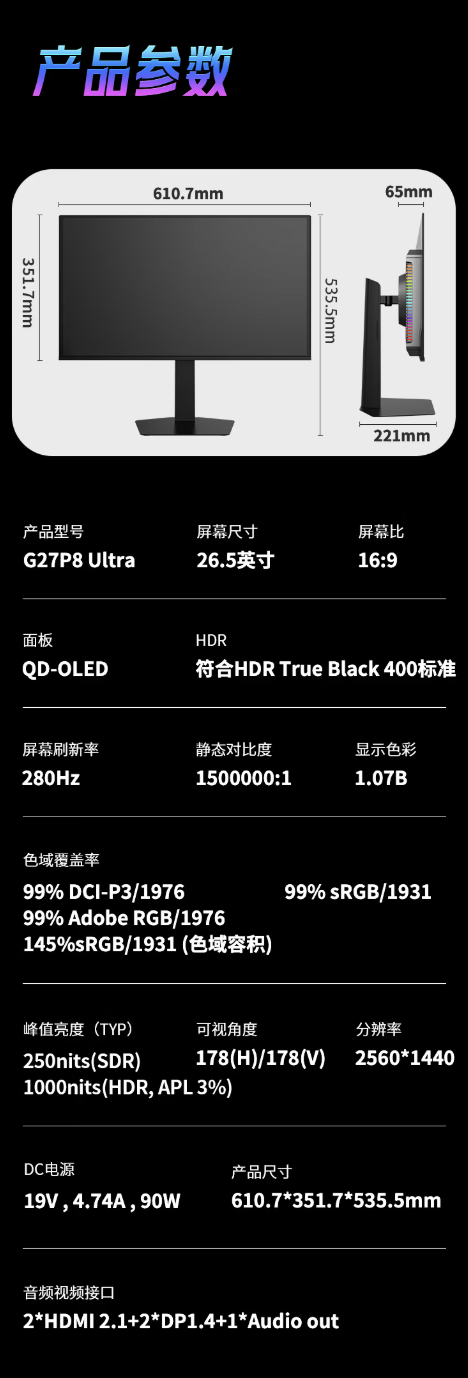 据介绍,这款显示器配备第四代 QD-OLED 面板,最高刷新率可达 280Hz,GTG 响应时间 0.03ms,HDR 峰值亮度 1000 尼特,静态对比度 1500000:1,符合 HDR True Black 400 标准。
