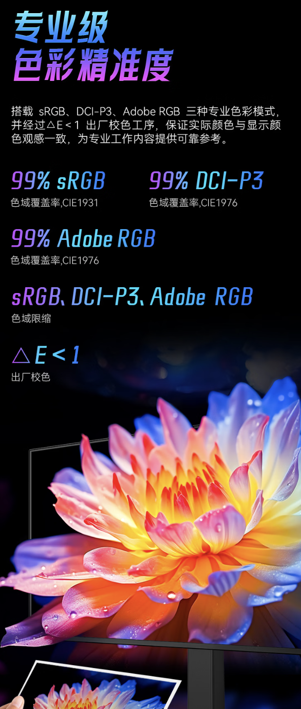 规格方面,这款显示器覆盖 99% sRGB、99% DCI-P3 以及 99% Adobe RGB 色域,出厂校色 DeltaE 小于 1,分辨率为 2560*1440,支持像素移动技术,可防止烧屏现象产生,机身内部拥有散热片以及石墨烯薄膜,可降低整体温度,支持宽屏、点对点、4:3 以及自动四种显示模式。