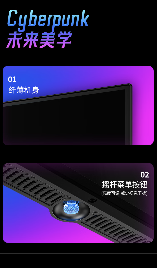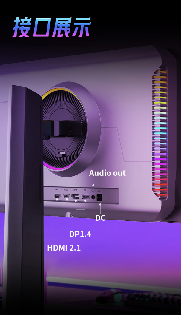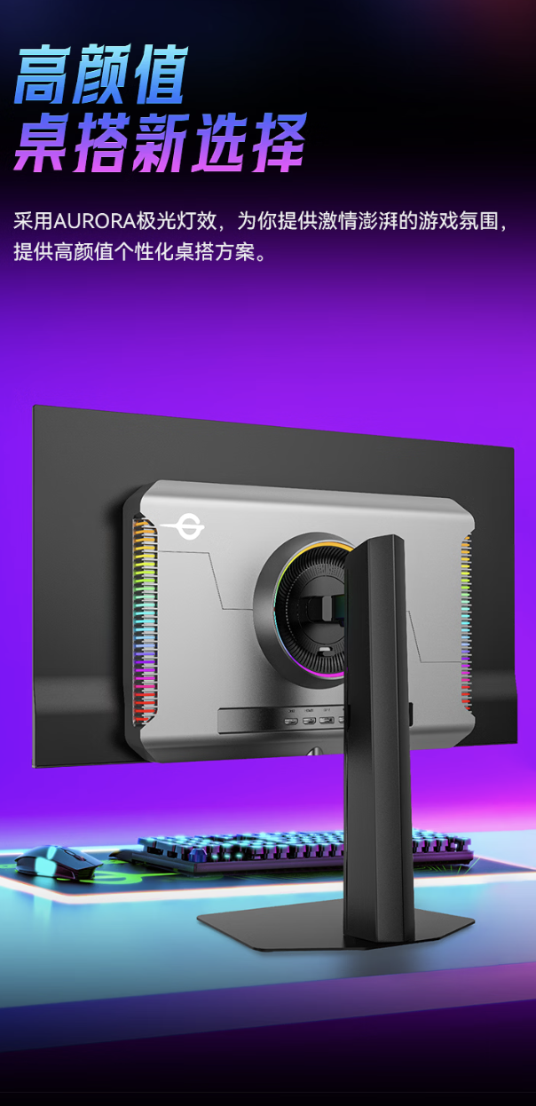 此外,这款显示器还带有 Adaptive- Sync 防撕裂技术,配备游戏准星、计时、秒表、刷新率显示、鹰眼放大等游戏辅助功能,自带支架支持升降、俯仰、左右旋转以及竖屏调整,背部带有 AURORA 极光灯效,为用户提供电竞氛围。