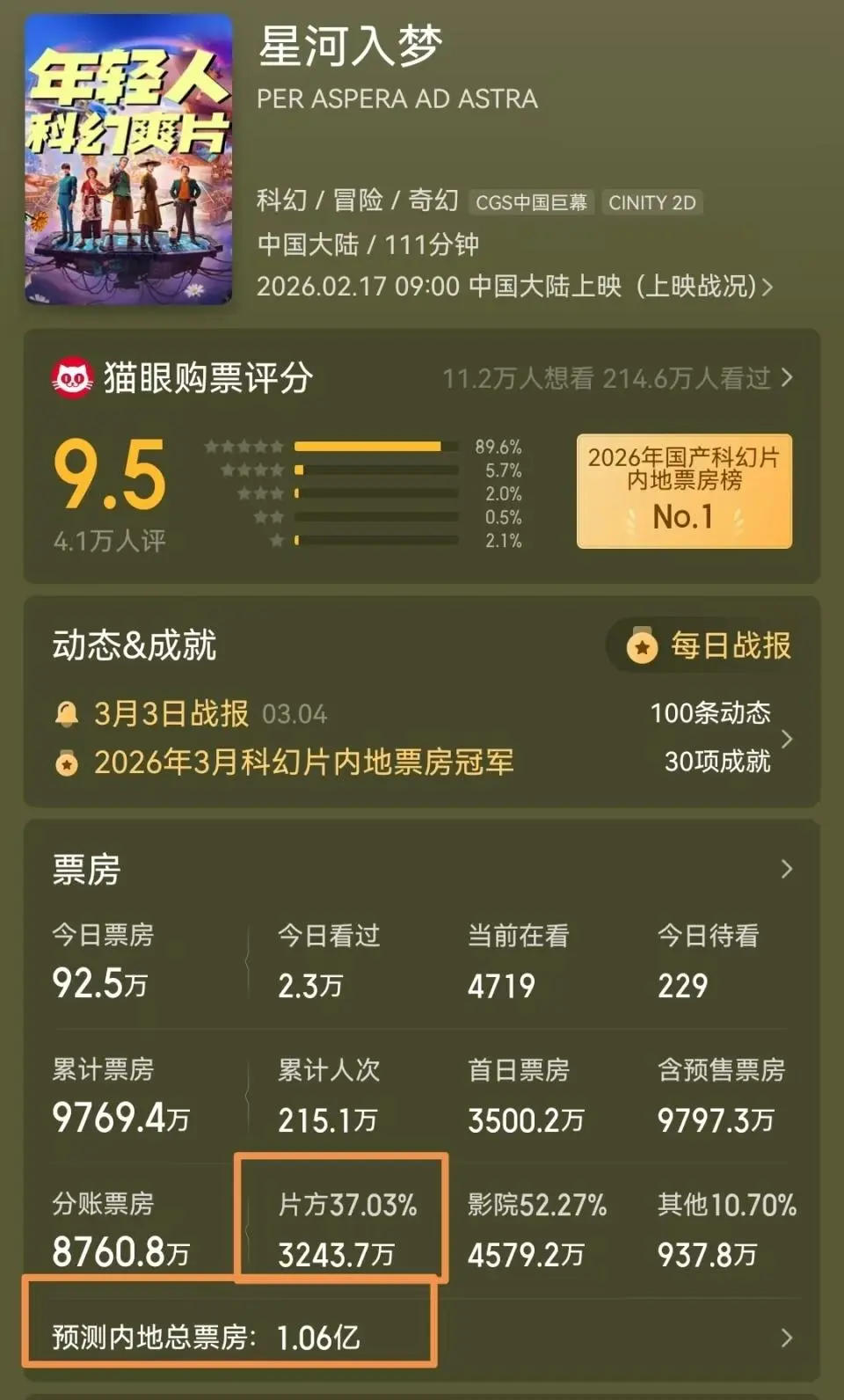 截至3月5号23点,《星河入梦》的排片维持在2.6%,单日票房仅92万,上映17天,总票房仅9769万,预测落点也就在1亿左右。