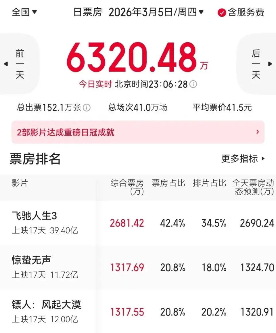 截至3月5日23点,内地单日票房排行榜发生了改变,前三甲分别为《飞驰人生3》《惊蛰无声》和《镖人》。