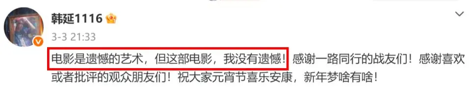 3月3日,导演韩延在个人社交平台发文:电影是遗憾的艺术,但这部电影,我没有遗憾!