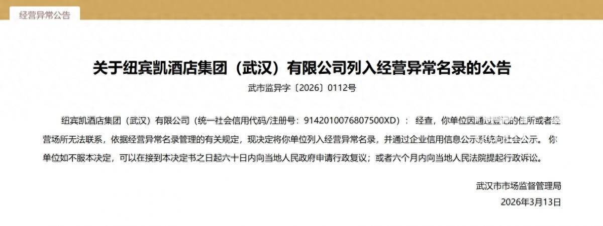 信网·信号新闻3月20日讯 3月13日,武汉市市场监督管理局发布公告,将纽宾凯酒店集团(武汉)有限公司列入经营异常名录,因该公司通过登记的住所或者经营场所无法联系。